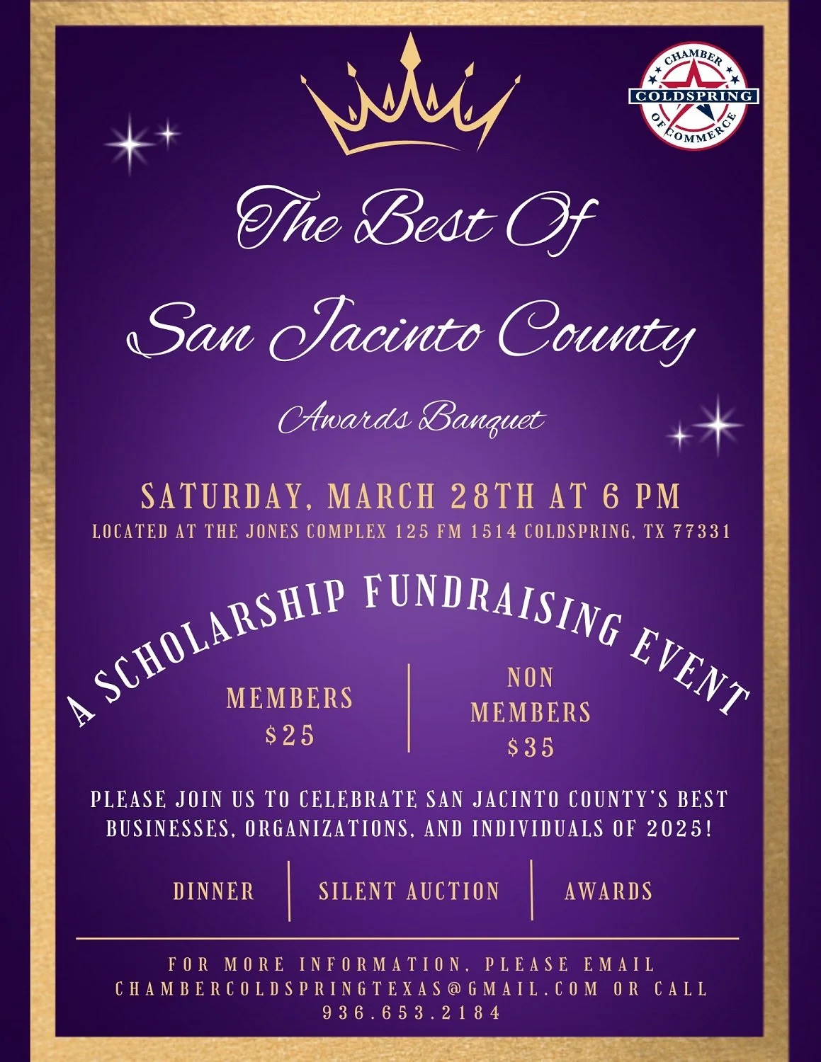 Join us for an unforgettable evening at the Best of San Jacinto County Scholarship Fundraising Awards Banquet. This special event celebrates the outstanding individuals, businesses, and organizations that make San Jacinto County a wonderful place to live while raising funds to support scholarship programs for students at Coldspring-Oakhurst High School.